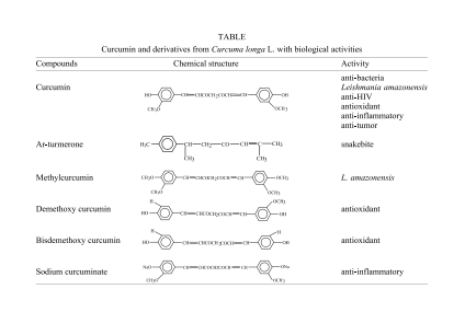 « La curcumine possède différents effets pharmacologiques et biologiques, décrits par des études in vitro et in vivo, notamment des effets antioxydants, cardioprotecteurs, anti-inflammatoires, antimicrobiens, néphroprotecteurs, antinéoplasiques, hépatoprotecteurs, immunomodulateurs, hypoglycémiants et antirhumatismaux. »